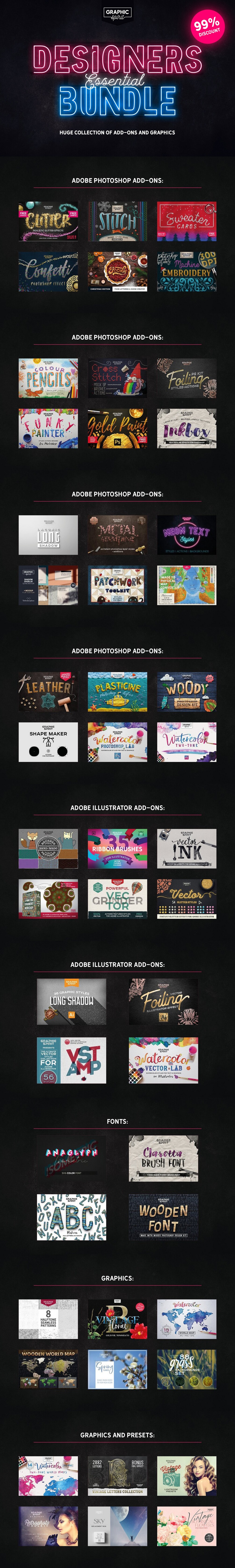 š Unleash limitless creativity with the DESIGNERS ESSENTIAL BUNDLE! Packed with actions, effects, graphics, and layer styles for Ai, Ps, and Photoshop Elements. Elevate your designs effortlessly. Dive into a world where every design turns to gold! āØ