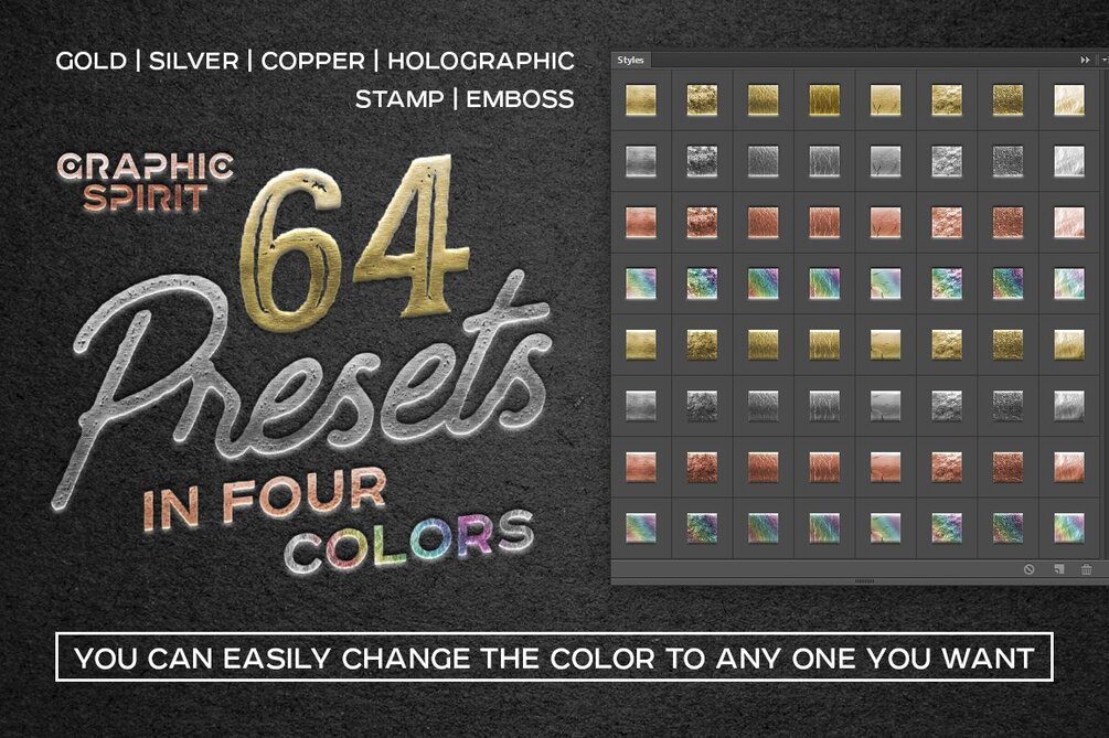 Create sophisticated and remarkable projects based on foil stamp effects. If you need to develop your own design use FOIL STAMP Styles+Actions. Change, mix and add new colors for brilliant results.