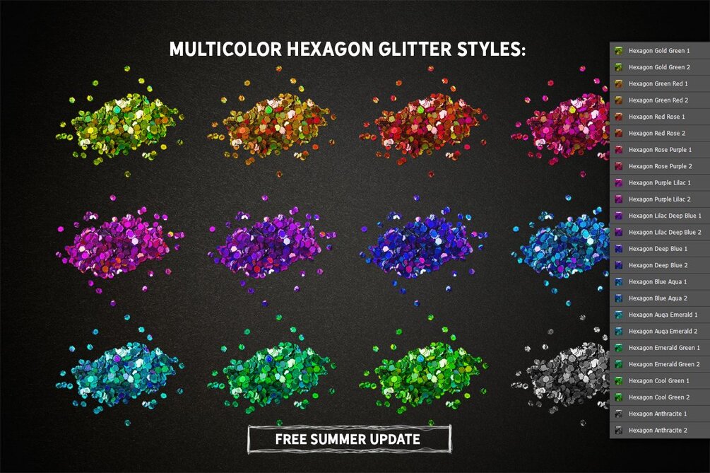 - 16 Color Hexagon Glitter Styles (Silver, Gold, Gold Apricot, Copper, Gold Red, Rose, Pink, Lilac, Purple, Deep Blue, Blue, Gentle Blue, Aqua, Emerald, Green, Green Gold)