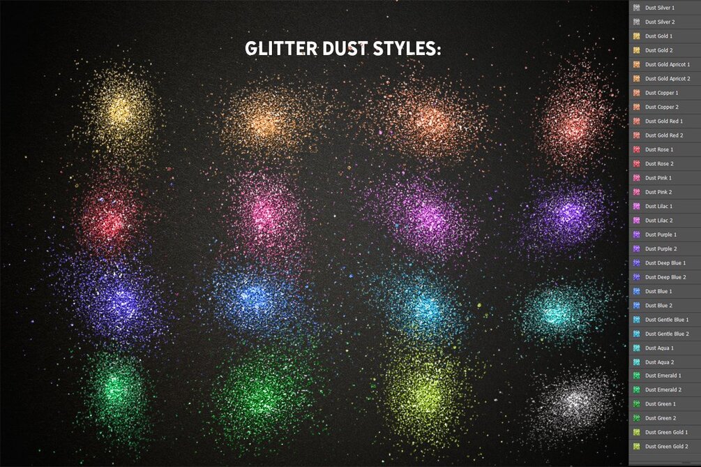 - 16 Color Dust Glitter Styles (Silver, Gold, Gold Apricot, Copper, Gold Red, Rose, Pink, Lilac, Purple, Deep Blue, Blue, Gentle Blue, Aqua, Emerald, Green, Green Gold)