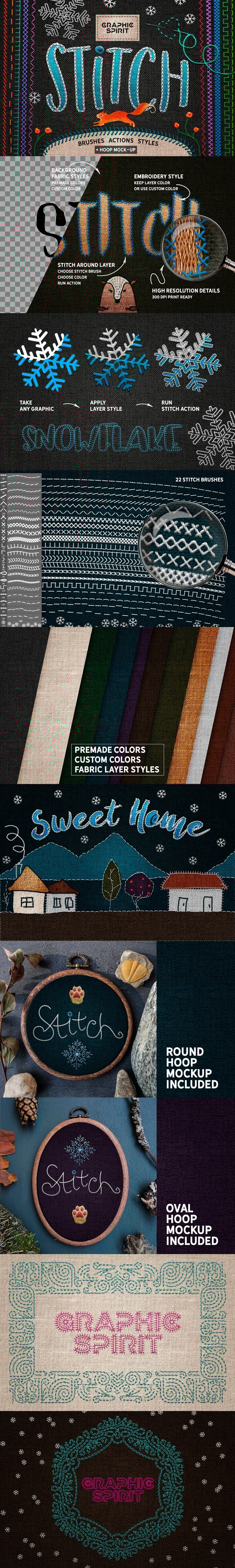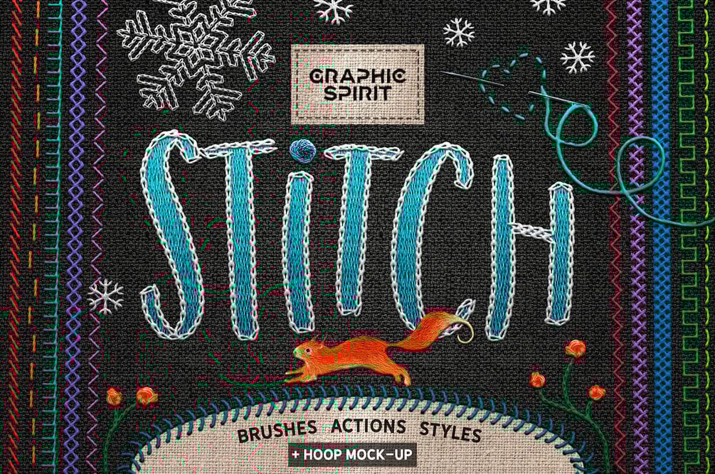 Add a little stitch to your design! Get this whole toolkit in one: brush, styles, actions, and mockups. Turn in hand-stitched style any text or graphics, or create your own design inspired by this realistic look of thread stitches, textures, fabrics and instant effect around the seam.