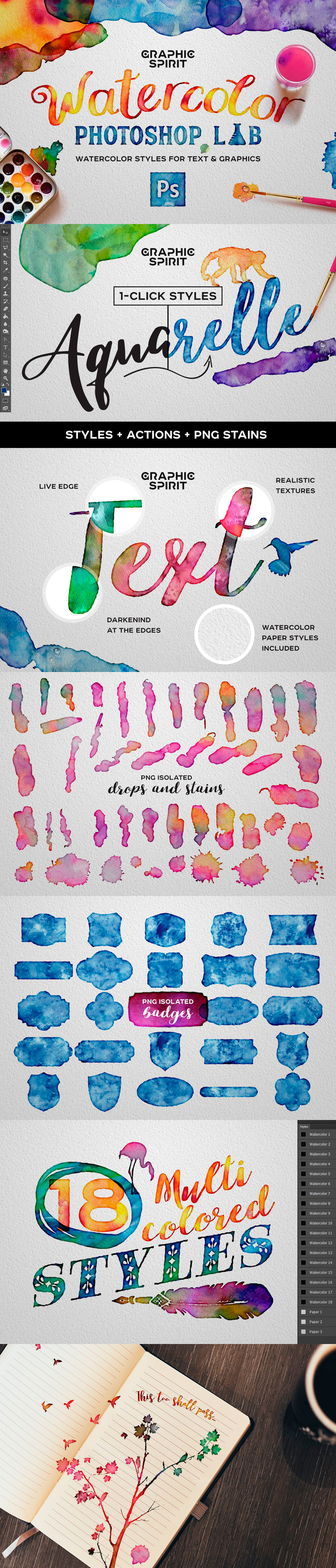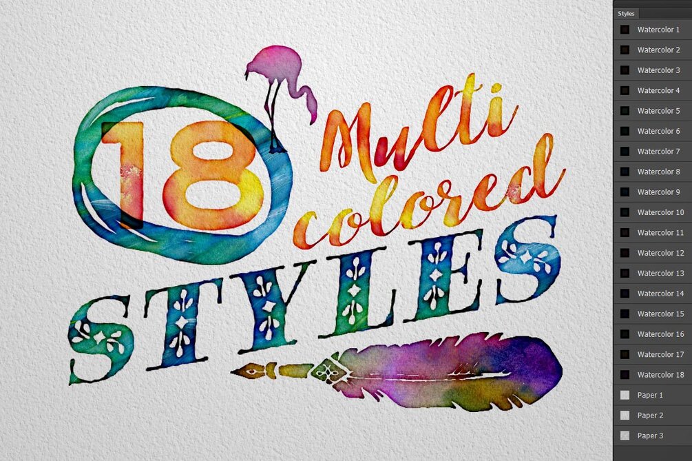 - 18 multi-colored realistic styles (RGB 72 dpi, 300 dpi CS3/CS4/CS5/CS6/CC)